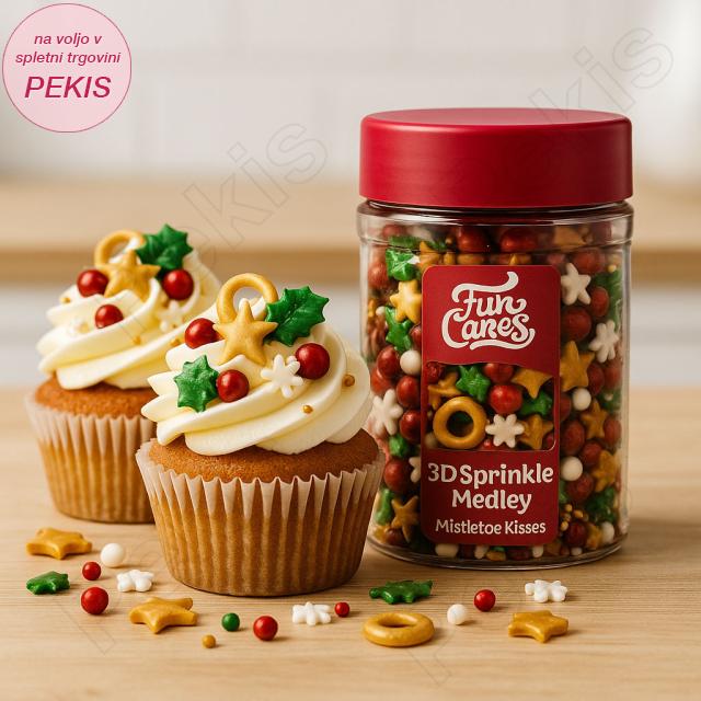 Pakiran je v priročno posodico, ki omogoča enostavno doziranje in ohranja svežino, zato je vedno pripravljen za ustvarjanje prazničnih čudes. 3D posip Poljubi pod omelo je popolna izbira za vse, ki želijo svojim sladicam dodati praznični pridih, ustvariti očarljiv videz in navdušiti goste že ob prvem pogledu. Pretvorite svoje sladice v praznične umetnine, ki bodo zasijale na vsaki mizi.