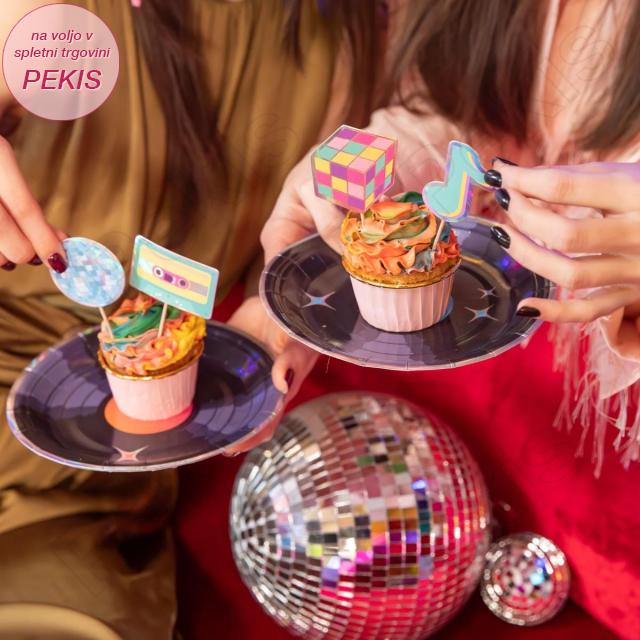 Popestrite mizo z retro glasbenim setom topperjev: vinilna plošča, glasbena nota, kaseta, barvni kockasti motiv, rolar, boombox, še ena nota in disco krogla. Žive barve in čisti robovi ustvarijo profesionalen videz na muffinih, tortah in kolačkih – idealno za rojstne dneve, karaoke večere, šolske nastope in tematske “disco/80’s” zabave.