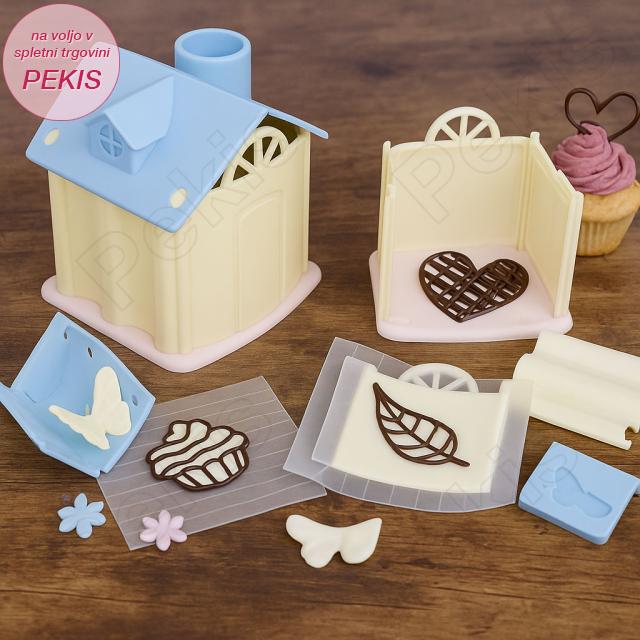 Odkrijte popolno orodje za ustvarjanje čudovitih čokoladnih in fondantnih dekoracij – kreativno hišo 14-delnega kompleta. Ta inovativna hiška omogoča natančno oblikovanje motivov, saj jo lahko preprosto razstavite in uporabite posamezne dele kot ustvarjalno podlago za dekoracije. V kompletu so vključene tudi silikonske predloge z različnimi vzorci – srčki, cvetovi, metulji in kolački – ki omogočajo popolno izvedbo vsake sladke ideje. Izdelana je iz varnih materialov za stik z živili, enostavna za čiščenje in primerna za profesionalne in domače slaščičarje.