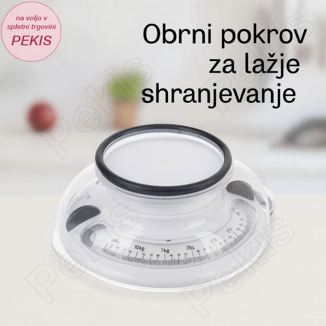 Odstranljiva plastična posoda z izlivom prostornine 1,4 l je izjemno praktična – omogoča hitro prelivanje tekočin in enostavno doziranje sestavin. Posoda je opremljena z nedrsečo gumo, ki zagotavlja stabilnost, tehtnica pa ima dodatno zaščito s silikonskimi blazinicami na podnožju, kar preprečuje drsenje po kuhinjskem pultu.