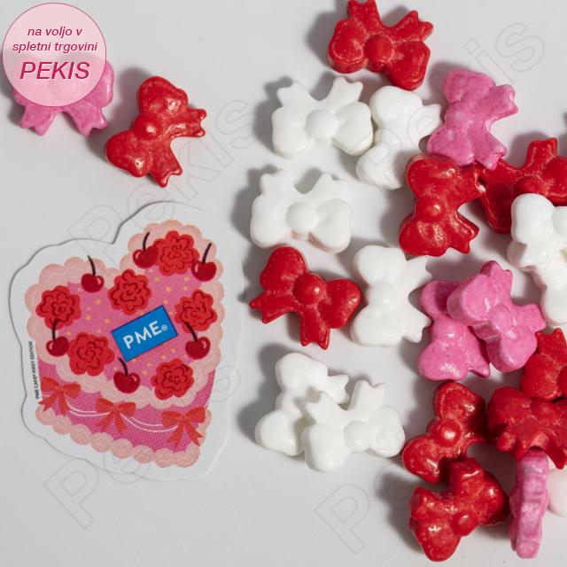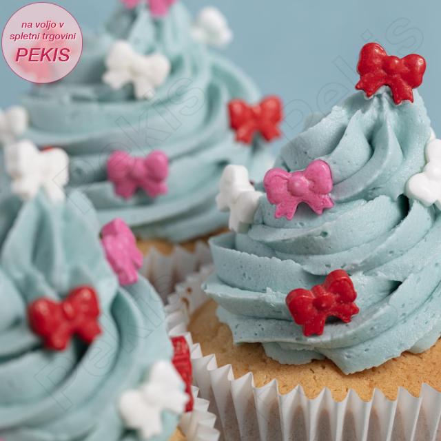 Nežno bleščeče pentljice v odtenkih rdeče, rožnate in bele ustvarijo občutek čiste sladkosti, kot bi se vsak grižljaj ovil v praznično darilno pentljo. Mehka hrustljavost teh drobnih dekoracij ustvari popoln trenutek presenečenja, saj se pod zobmi sprosti drobna sladkasta krhkost, ki sladici doda igriv, skoraj romantičen poudarek.