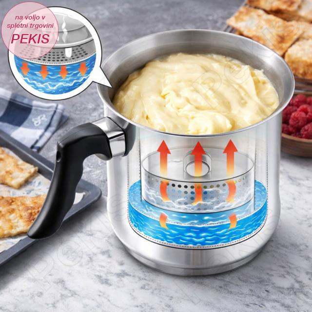 Nežno segrevanje brez zažiganja – popoln nadzor nad toploto. Kuhalnik mleka brez pokrova iz visokokakovostnega nerjavečega jekla ima posodo z dvojno steno, v katero nalijemo vodo. Ta ustvari zaščitni sloj, ki preprečuje zažiganje mleka, omak in pudingov ter ohranja čisto aromo in gladko teksturo.