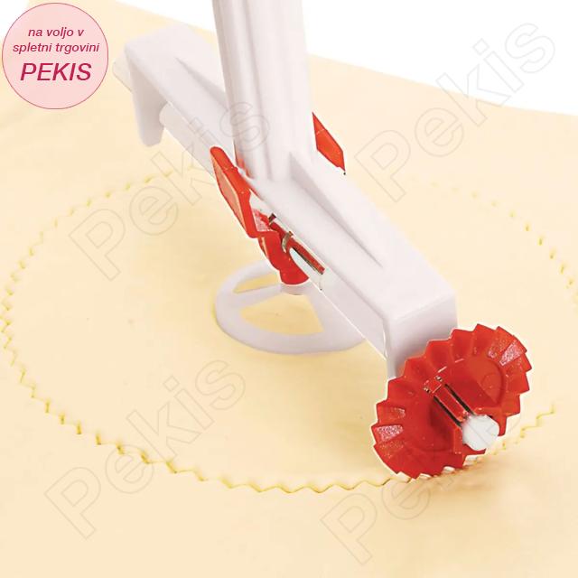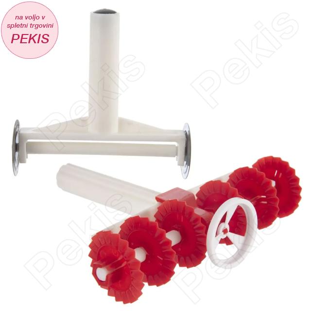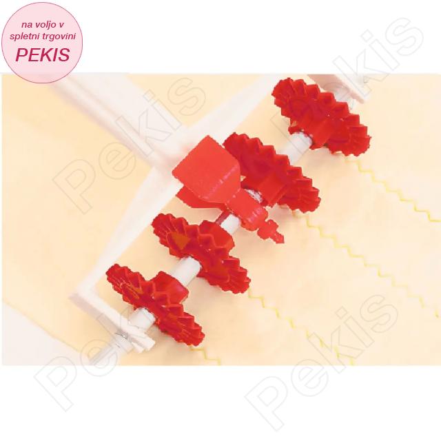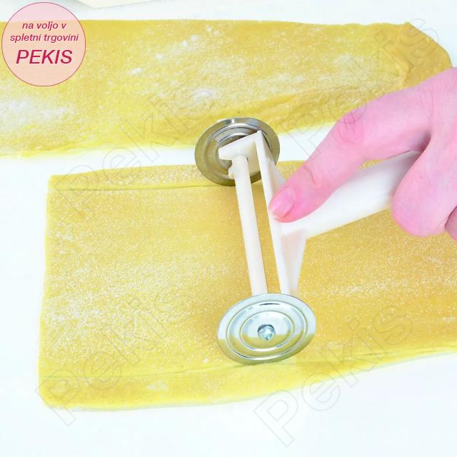 - Lopatico za pripravo pravilne širine testa in lopatico s 6 nastavki, s katerimi ustvarite enakomerne trakove ali kvadrate, lahko pa z dodatnim nastavkom izrežete kroge različnih velikosti.