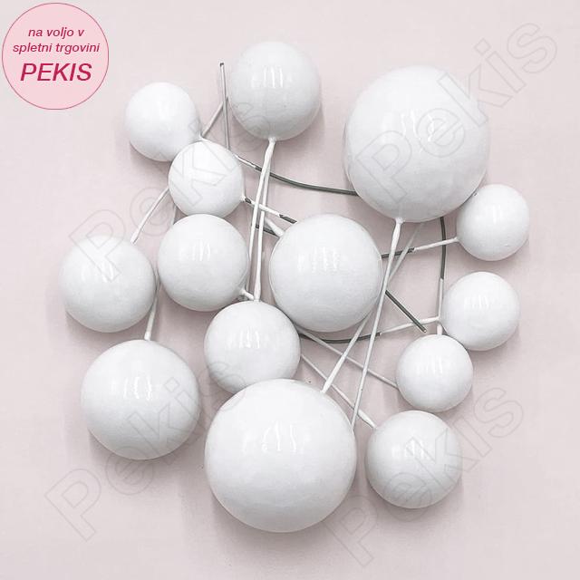 Elegantne topper kroglice za okrasitev torte v čisti beli barvi prinašajo pridih brezčasne elegance in sofisticiranosti vsaki slaščici – od poročnih in rojstnodnevnih do tematskih tort. Z različnimi premeri približno 2 cm, 2,5 cm, 3 cm in 4 cm omogočajo ustvarjanje izjemno privlačnih, večplastnih dekoracij. Komplet vsebuje 20 kosov, izdelanih iz kakovostne plastike z žico za cvetje, primernih za večkratno uporabo.