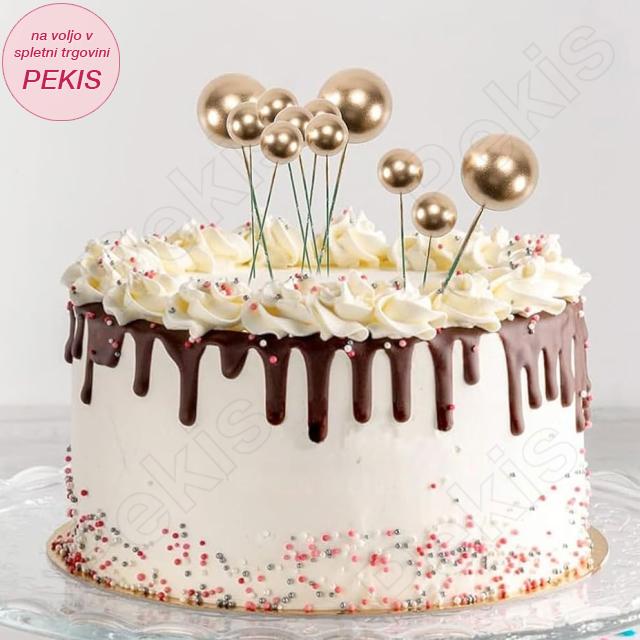 Zlate topper kroglice dodajo tortam prestižen sijaj, eleganco in profesionalen zaključek, ki izstopa na vsakem praznovanju in pritegne pozornost ob vsaki posebni priložnosti.