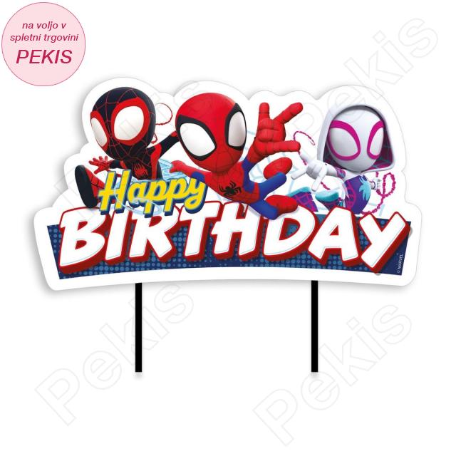 Topper prikazuje Spideyja v akciji skupaj z njegovimi junaki in velikim, barvitim napisom "Happy Birthday", ki takoj pritegne pozornost. Zaradi svoje žive barvne kombinacije v rdeče-modrih odtenkih je popoln osrednji poudarek na vsaki torti – še posebej na zabavah s superherojsko tematiko ali rojstnih dnevih, kjer vlada Spiderman.