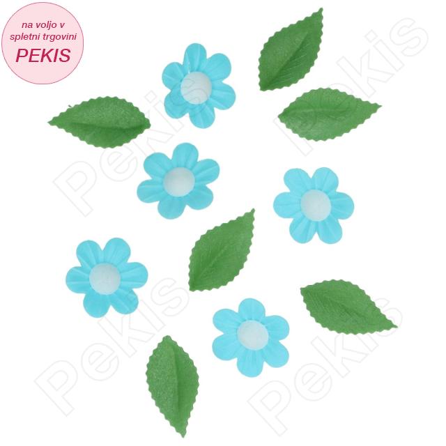 - Komplet vsebuje 11 užitnih okraskov iz oblatov (modri cvetovi in zeleni listi).