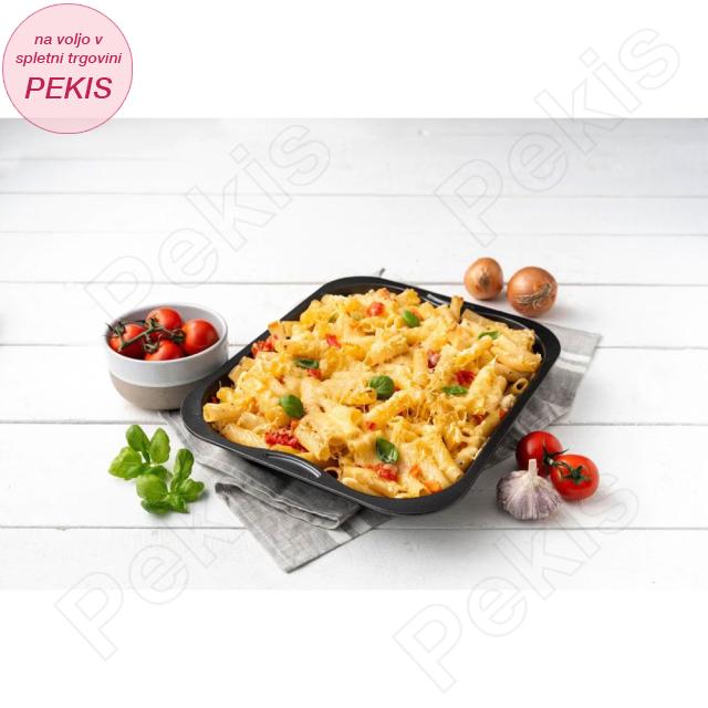 Njena klasična črna barva in čiste linije se popolnoma podajo vsaki kuhinji, stranski vdolbeni ročaji pa poskrbijo za varen in preprost oprijem, ko pekač jemljete iz vroče pečice. Posebna zasnova omogoča tudi uporabo druge posode kot pokrova, kar poveča uporabnost in olajša pripravo različnih jedi.